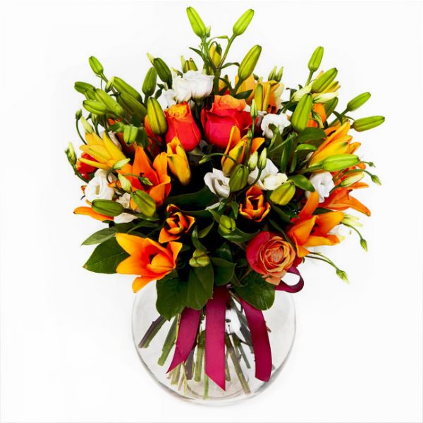 ₪ 125.00 – ₪ 215.00זר פרחים מעוצב בסגנון מודרני בגוונים כתום,אדום וירוק, משלב פרחי כרטמוס, ורדים, חרצית, ואלמנטים ירוקים, מגיע עם קישוט ואריזת יוטה.… -